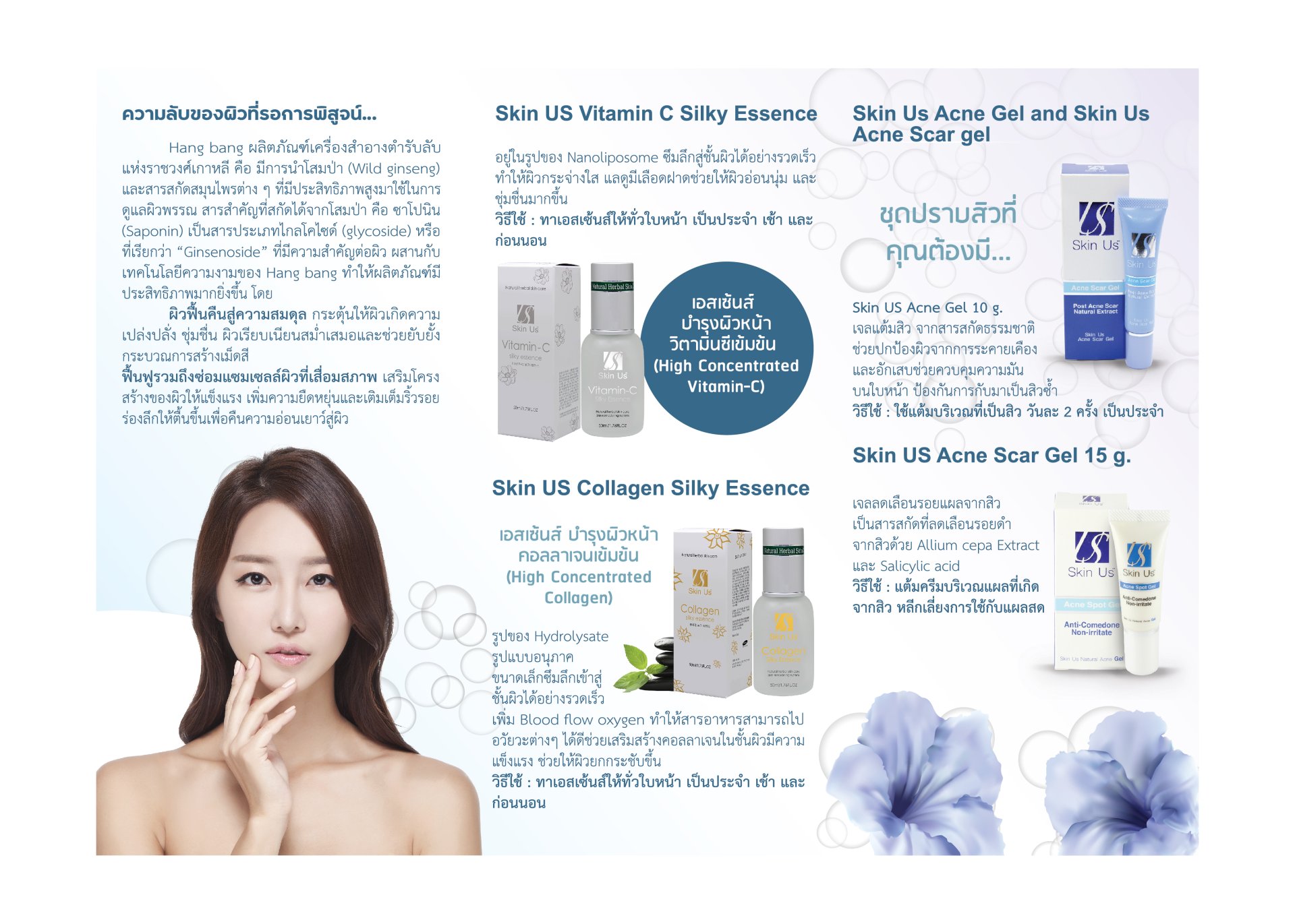 นอกจากนี้ทาง Skinus ได้คิดค้นสูตรเฉพาะของ Skinus สำหรับผลิตภัณฑ์ครีมกันแดด ครีมลดริ้วรอย และครีมลดการอักเสบของสิว ทำให้ครีมซึมซับสู่ผิวเร็ว เหมาะกับทุกสภาพผิวและทุกสีผิว